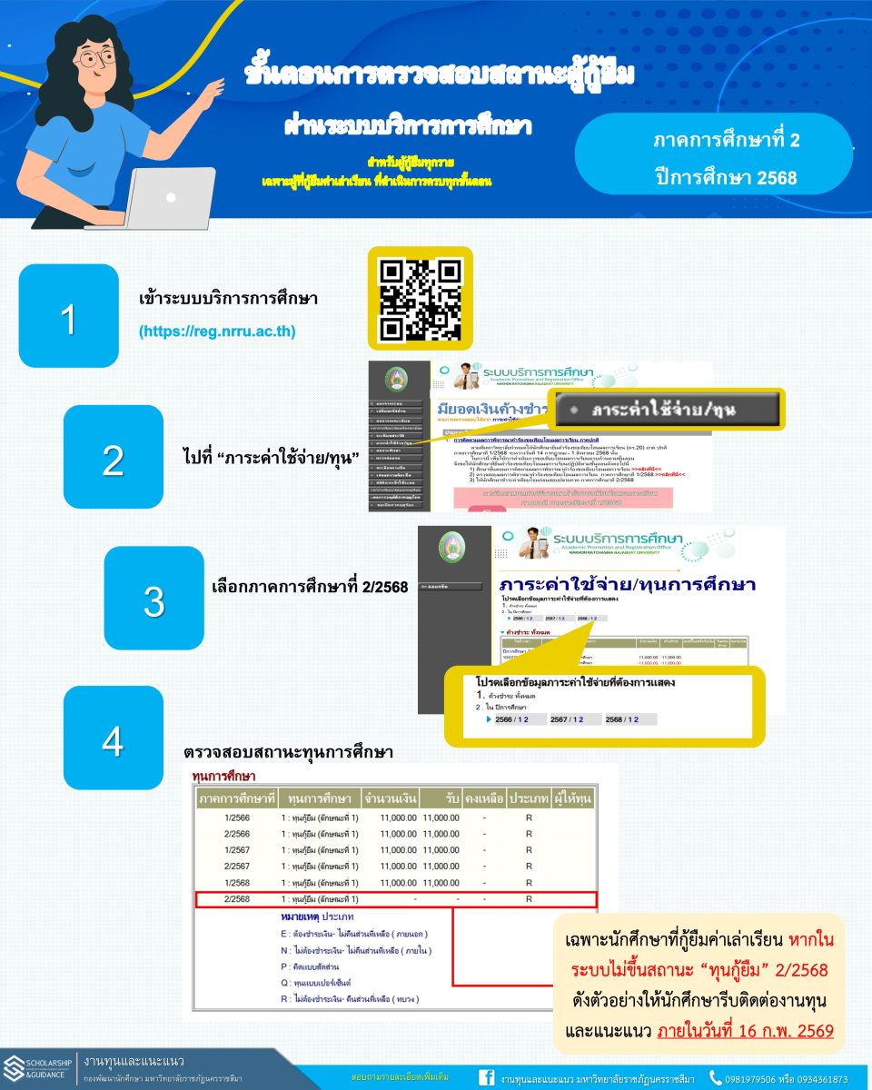 ให้นักศึกษาตรวจสอบสถานะผู้กู้ยืมผ่านระบบบริการการศึกษา สำหรับนักศึกษาผู้กู้ยืมกองทุนเงินให้กู้ยืมเพื่อการศึกษา ผู้กู้ยืมทุกราย ภาคปกติ/กศ.ปช. ทุกลักษณะ ทุกคณะ ทุกชั้นปี (เฉพาะนักศึกษาผู้ที่กู้ยืมค่าเล่าเรียน ที่ดำเนินการครบทุกขั้นตอน) ตั้งแต่วันนี้จนถึงวันที่ 16 กุมภาพันธ์ 2569 หากในระบบไม่ขึ้นสถานะดังตัวอย่างด้านล่างให้นักศึกษาติดต่องานทุนและแนะแนวโดยด่วน สอบถามรายละเอียดเพิ่มเติม โทรศัพท์ 0981979506 หรือ 0934361873