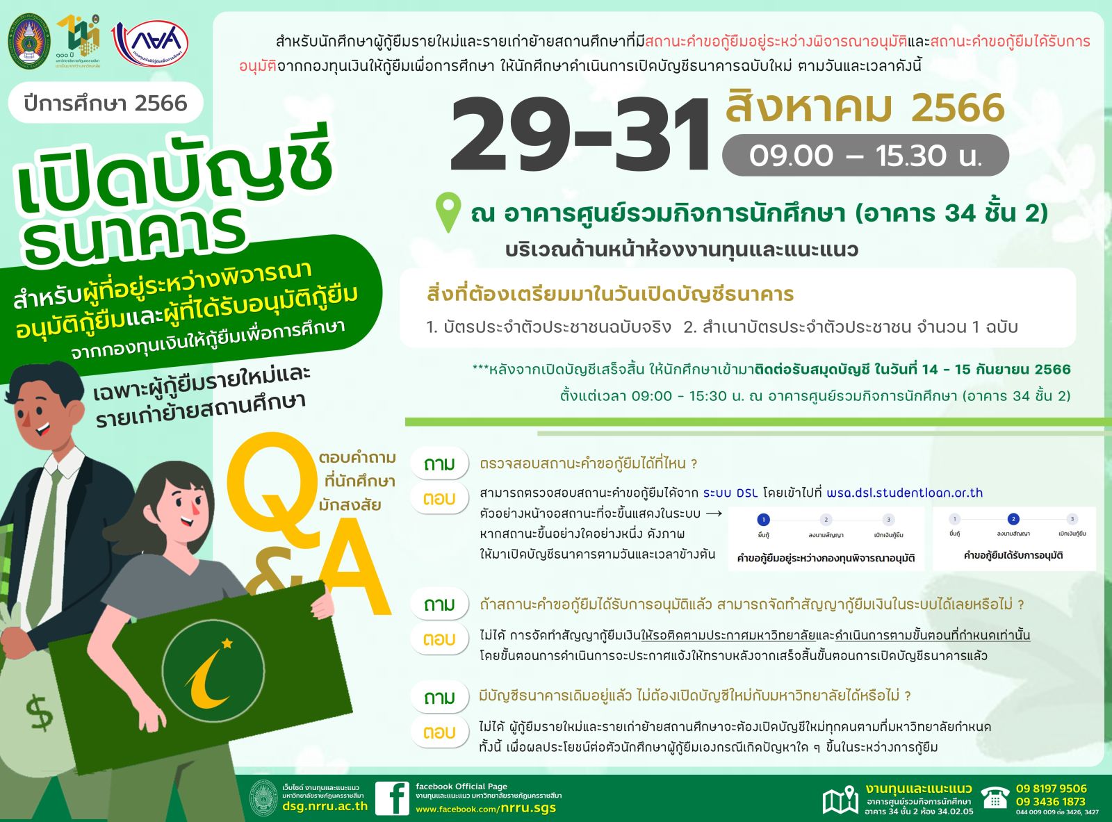 สำหรับนักศึกษาผู้กู้ยืมรายใหม่และรายเก่าย้ายสถานศึกษาที่มีสถานะคำขอกู้ยืมอยู่ระหว่างพิจารณาอนุมัติและสถานะคำขอกู้ยืมได้รับการอนุมัติจากกองทุนเงินให้กู้ยืมเพื่อการศึกษา ให้นักศึกษาดำเนินการเปิดบัญชีธนาคารฉบับใหม่ ในวันที่ 29 - 31 สิงหาคม 2566 ณ อาคารศูนย์รวมกิจการนักศึกษา (อาคาร 34 ชั้น 2) บริเวณด้านหน้าห้องงานทุนและแนะแนว